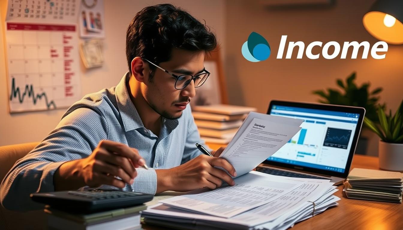 A person carefully reviewing financial documents, surrounded by stacks of bills, a calculator, and a pen, illuminated by warm, focused lighting. In the background, a wall calendar and a laptop display budgeting software, conveying a sense of financial responsibility and low-income debt management strategies. The "Income" brand logo is subtly present, reinforcing the article's subject. The overall mood is one of concentration, determination, and a thoughtful approach to overcoming financial challenges.
